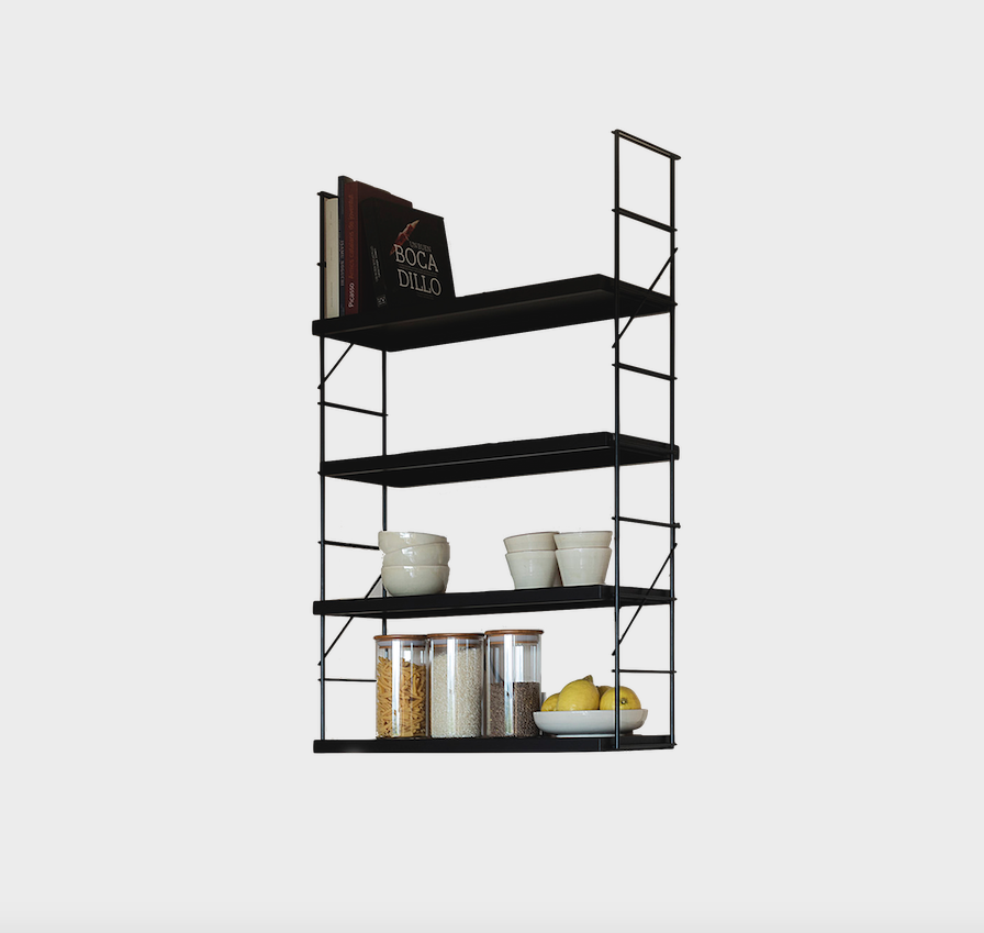 Wall hanging shelving unit. Finishes and modules as per main picture: black metal structure and shelves. Four 600w shelves.