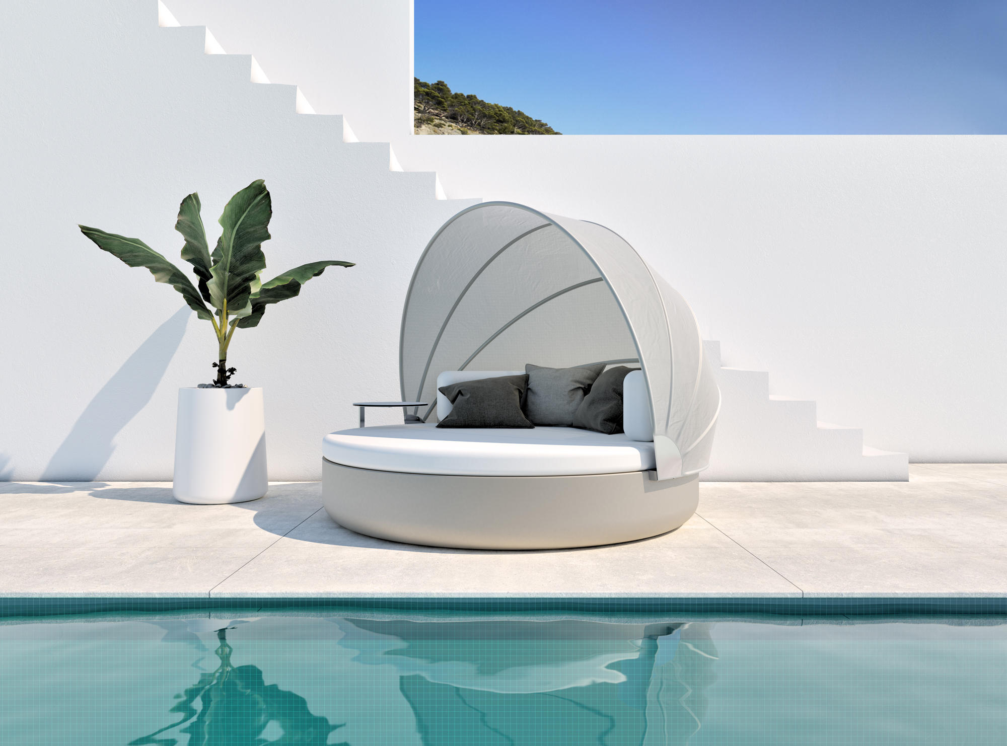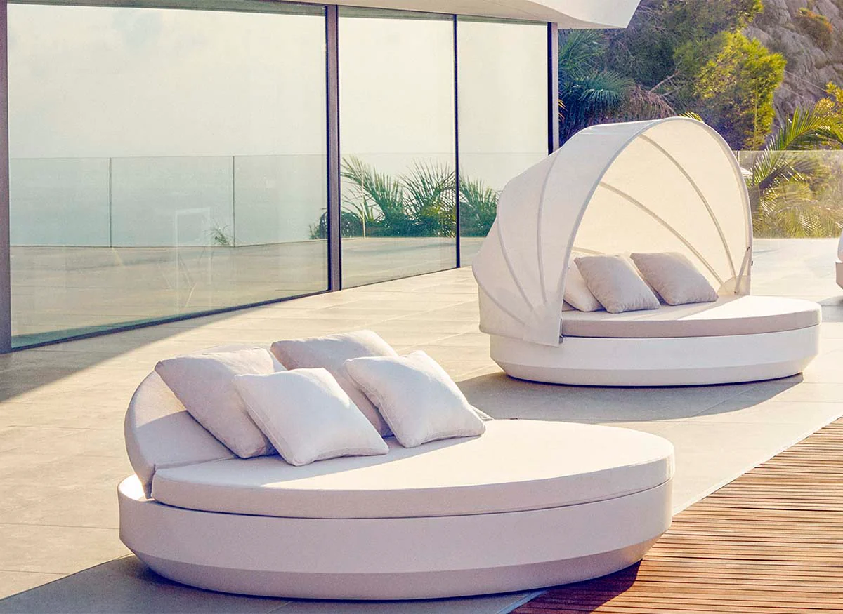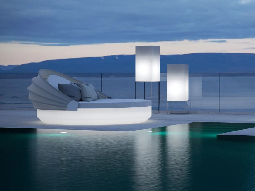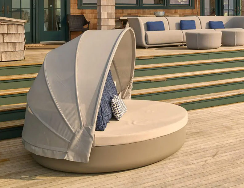 Customisation options include a selection of colours, finishes, and upholstery fabrics, as well as optional LED lighting for a striking nighttime ambiance. For added shade and privacy, the Ulm Daybed comes with a removable fabric canopy in a choice of sun-safe fabrics.
