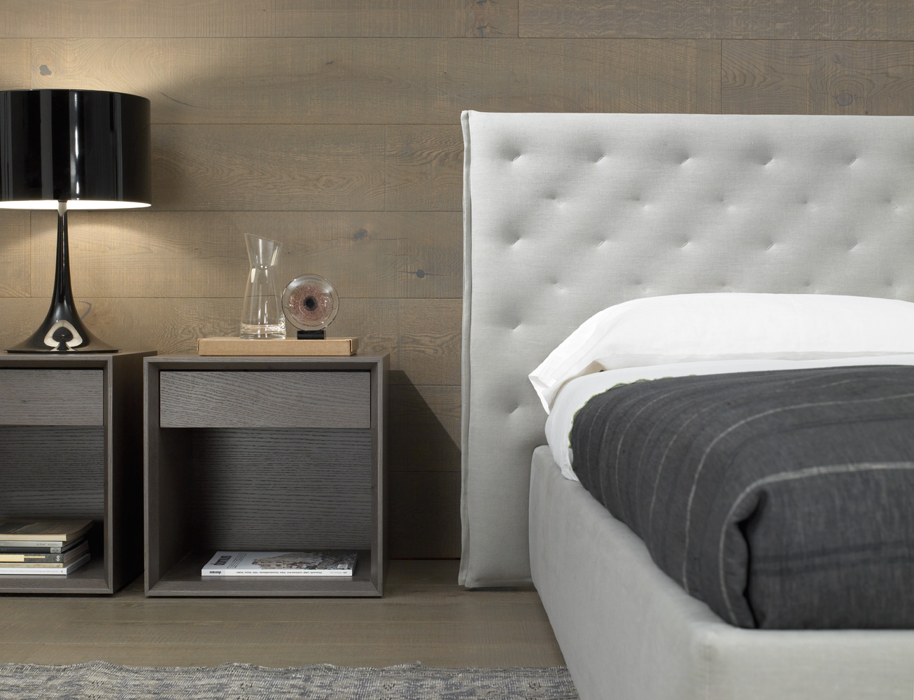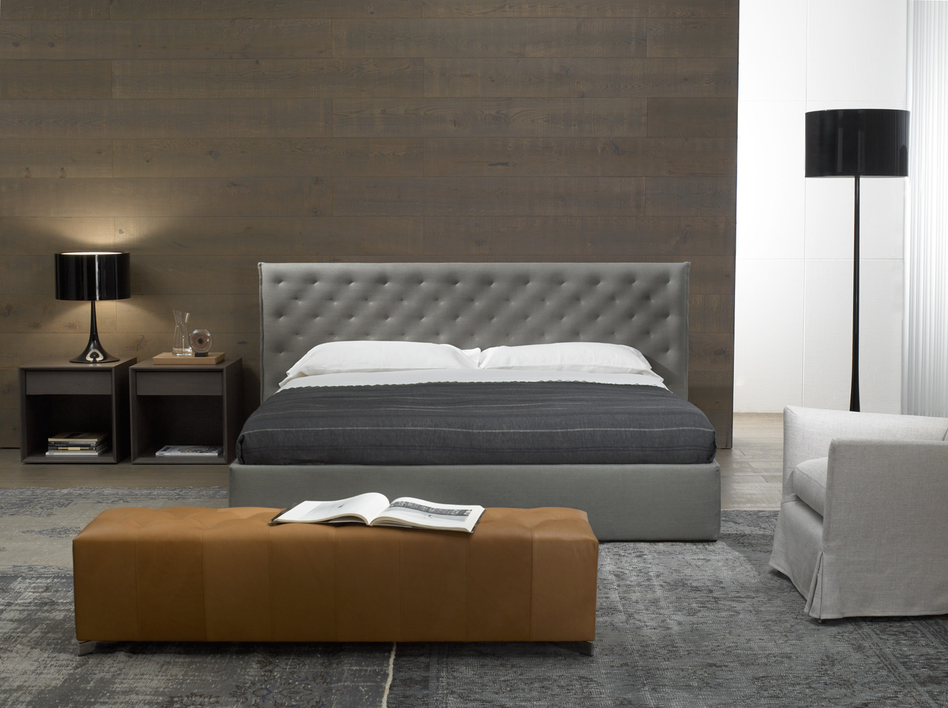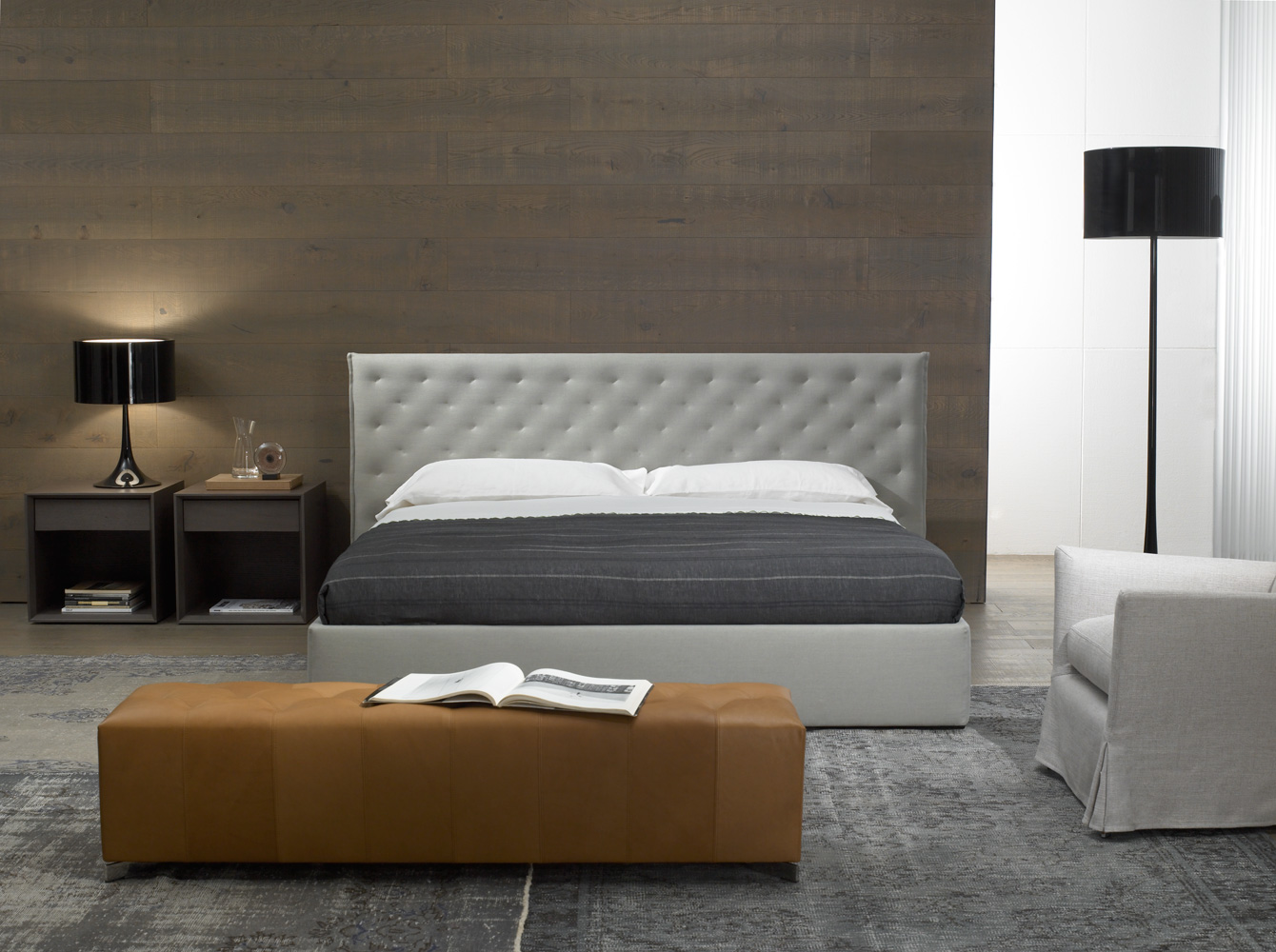 Valeria is a bed with clean and simple lines, with a touch of sophistication due to its capitoné with blunts. The thinness of the headboard as well as the frame allows it to be adapted to modern interiors where space is limited. It comes with a levelling system in order to adjust to the different sizes of slats and mattresses. The upholstery is completely removable and almost all parts can be detached.