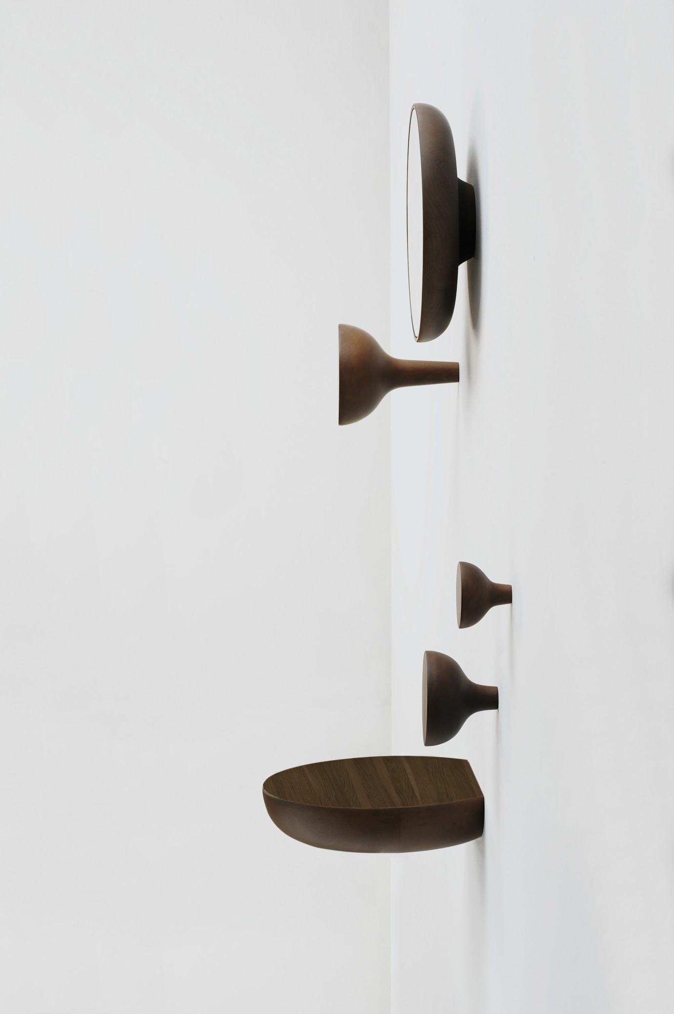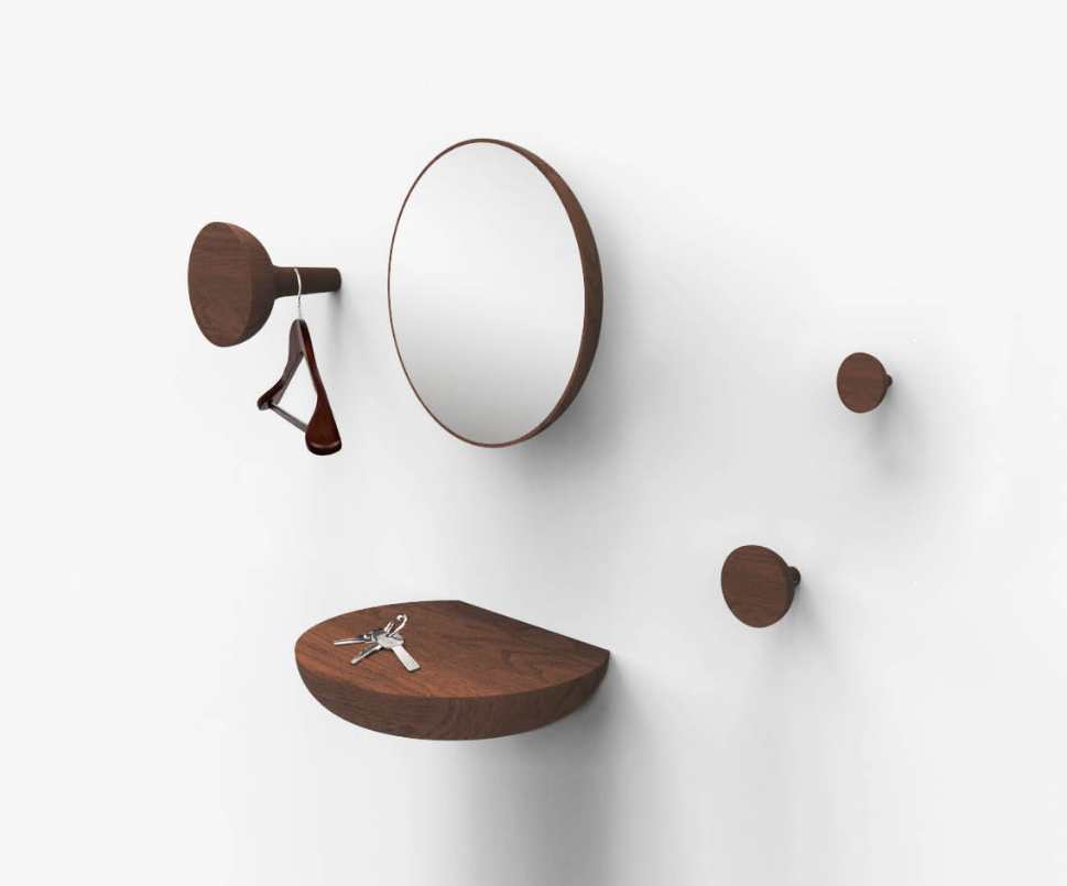 It is a presentation of our home and lifestyle, enhanced by its volume and quality of the handcrafted wood treatment. Make your own composition, install the mirror, the shelf and the hangers as you like. Made of solid wood with walnut plywood face.
