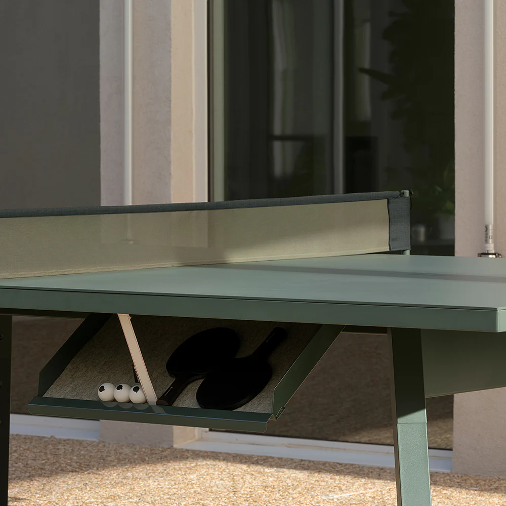 You and Me Monochrome is more than just a ping pong table with striking design and captivating colors. It goes beyond. The net, paddles, and balls are discreetly tucked away in its hidden side drawer, vanishing into the clean lines of its structure. And in an instant, it transforms into a versatile table, ready to adapt to any moment of the day—whether indoors or outdoors.