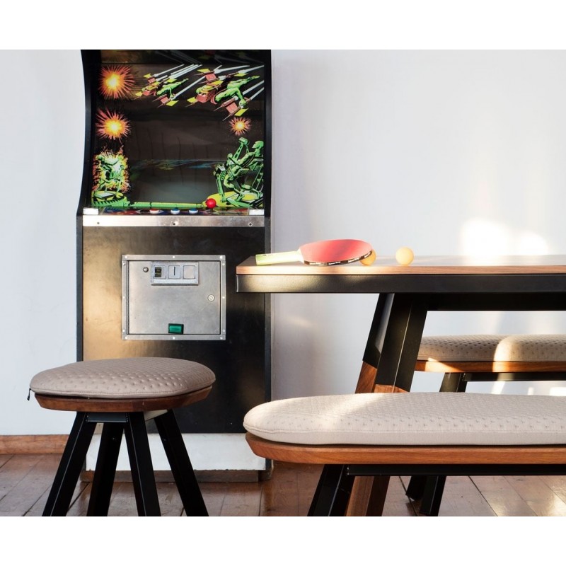 The perfect addition to the You and Me ping pong table, the outdoor stool and benches collection are made of a steel structure with cataphoretic coating and Iroko wood seat. Optional outdoor cushion upholstered in Natté fabric from Sunbrella.