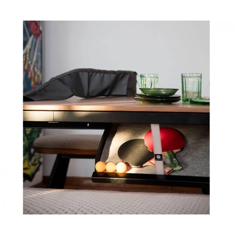Designed with premium materials, the table features a solid wood top with a sturdy yet elegant steel frame, ensuring durability and stability. When not in use for play, it transforms into a stylish dining or work table, making it an ideal choice for multi-functional spaces. It includes a custom net, paddles, and balls, all stored neatly in a discreet side drawer.