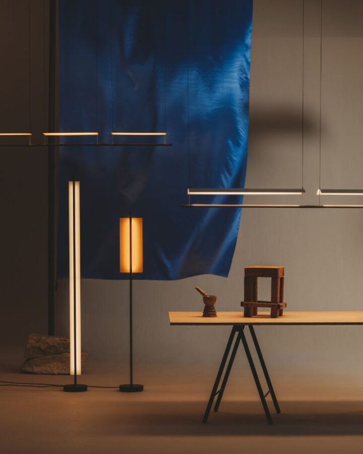 Initially introduced as a suspension lamp, Lámina has since evolved into a comprehensive lighting system that meets diverse needs. The collection now includes floor, wall, and table versions, expanding its functionality without compromising its minimalist aesthetic. The Lámina 165 and Lámina 45, named after the length of their shades, exemplify this evolution. These models now offer solutions for both floor and wall lighting, with the Lámina 45 also available as a table lamp.